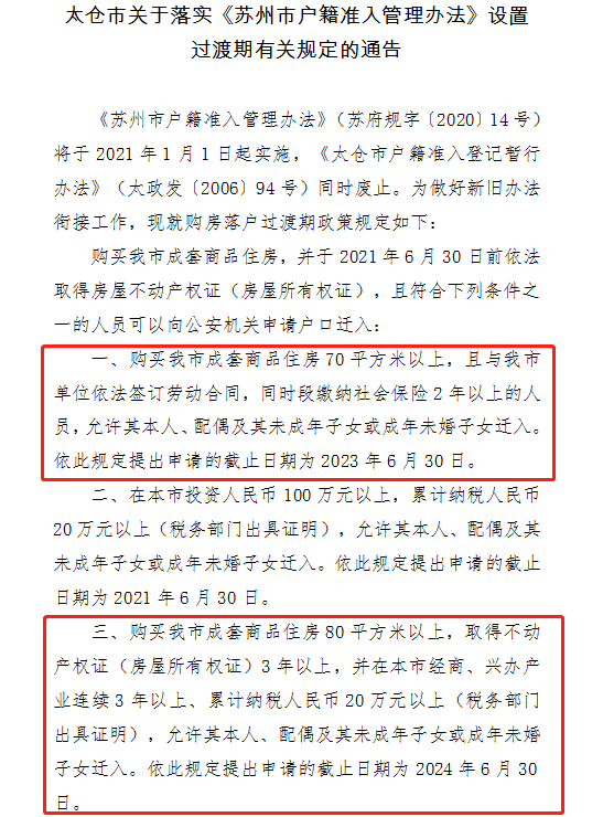 太仓市:具体分为三类,住房70平以上、住房80平以上以及投资100万以上,对应的申请截止日期为2023年6月30日、2024年6月30日、2021年6月3日。