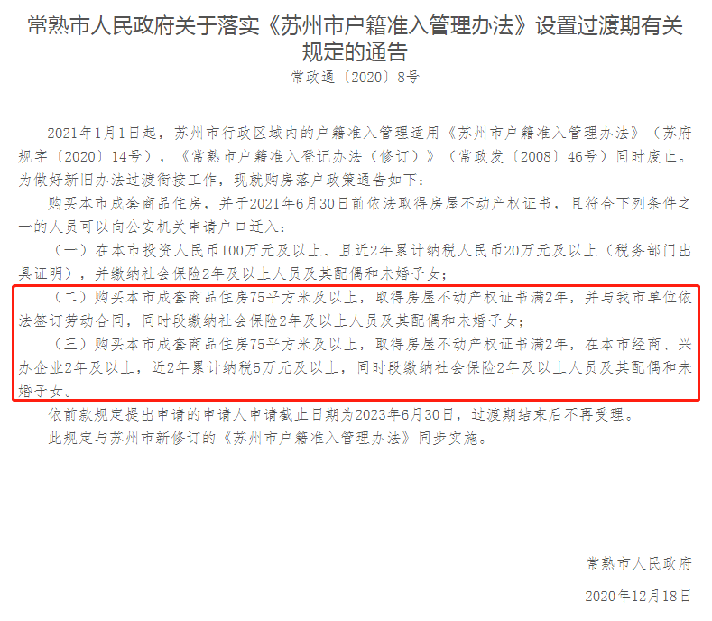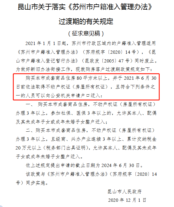 昆山市:购买成套商品住房80平以上在2021年6月30日前取得房产证,符合条件,仍然可以通过购房落户,落户申请截止日期为2024年6月30日。反馈意见中明确在过渡期内保持原购买房屋、投资纳税等落户政策不变,同时增加积分落户渠道。