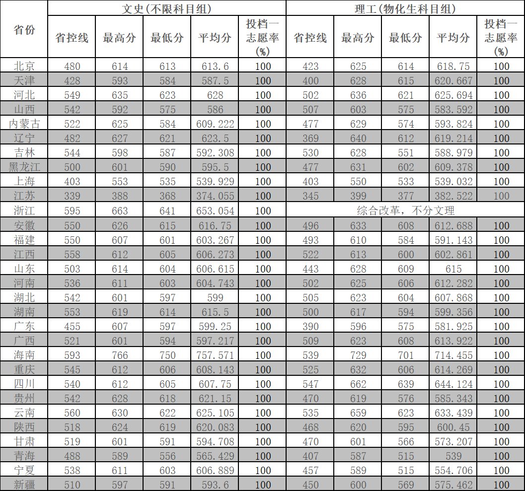 | 浙江 | 595 | 663 | 641 | 653.054 | 100 | 综合改革,不分文理 | ||||