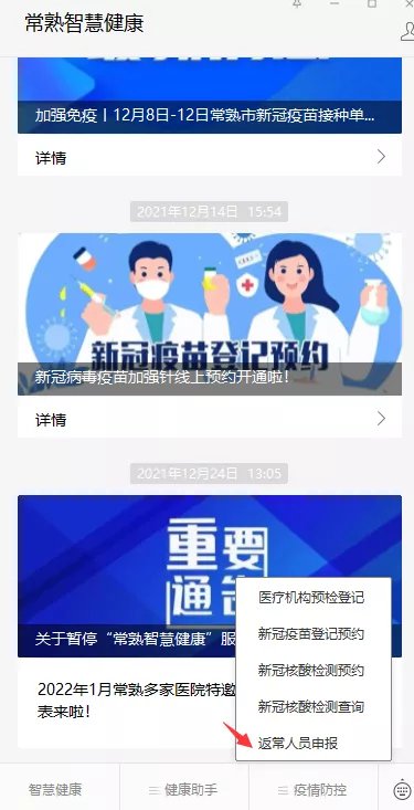 (1)在微信关注“常熟智慧健康”公众号,进入微信公众号点击右下角“疫情防控”。选择“返常人员申报”。