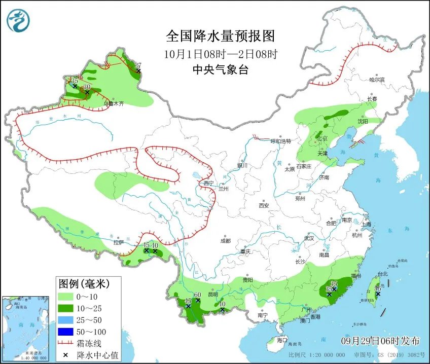 预计10月1日~2日福建台湾等地3日夜里~4日山东中北部有明显降雨过程
