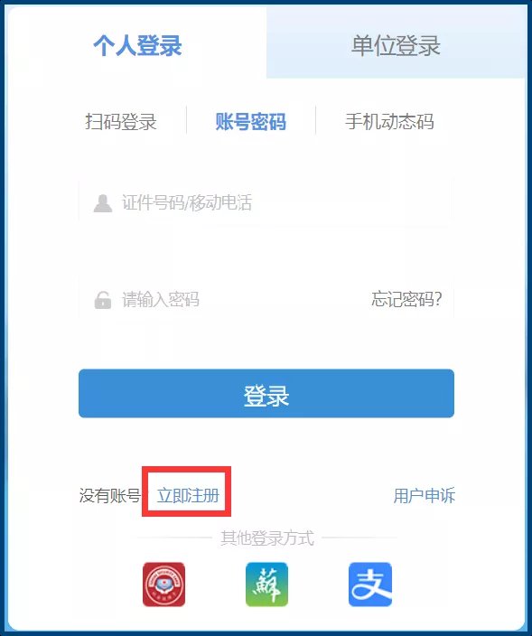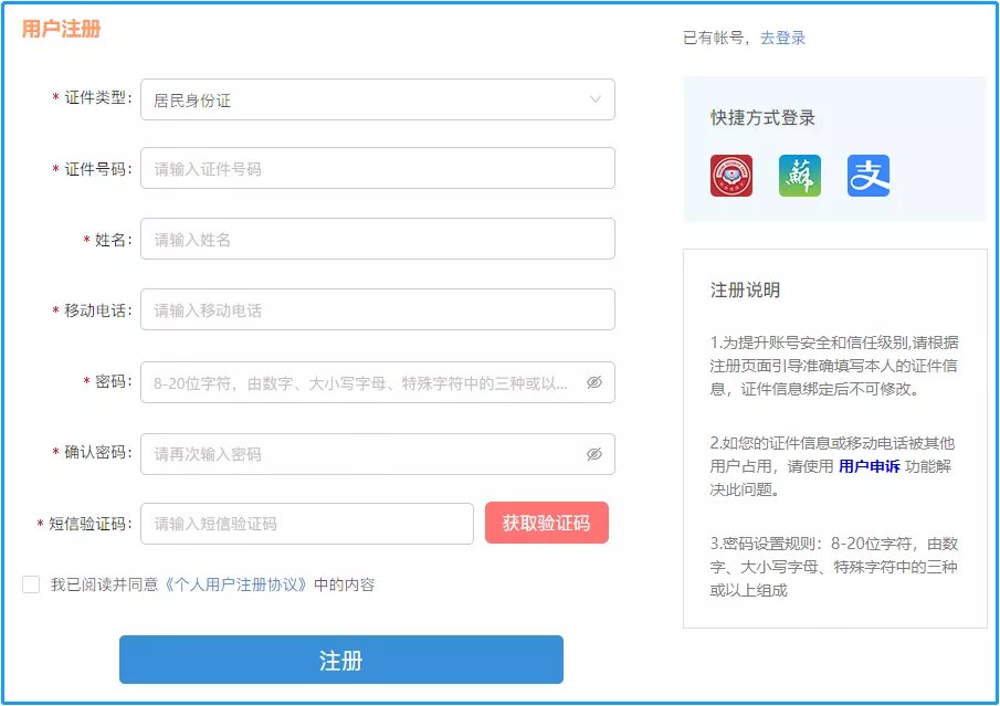 选择【立即注册】,按照要求填入注册信息,获取验证码后点击【注册】。