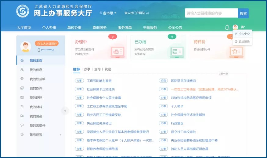 登录网办大厅(https://rs.jshrss.jiangsu.gov.cn)成功后,在右上角选择用户中心,进入个人用户中心。个人主页分上下两部分。上半部分是办件信息,包含办理中办件,已办结办件,待评价办件,点击可以快速查看详情,办件或者评价。下半部分主要是业务事项的管理,包含推荐、办事、查询、收藏。