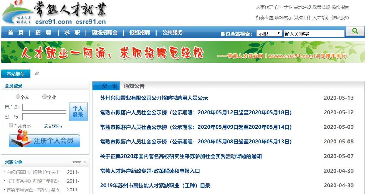 1. 个人登录常熟人才就业网。