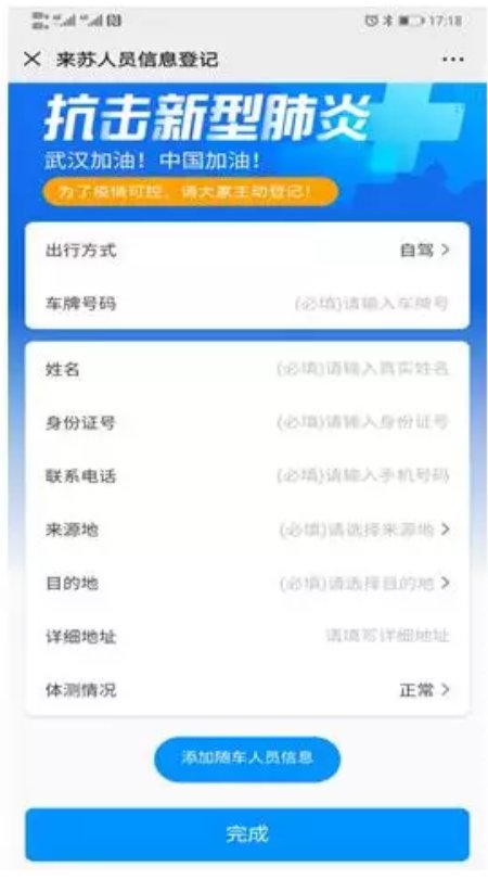 2、请如实填报个人信息,如果有随车人员也可以添加随车人员信息,填写完毕后点击“完成”按钮。