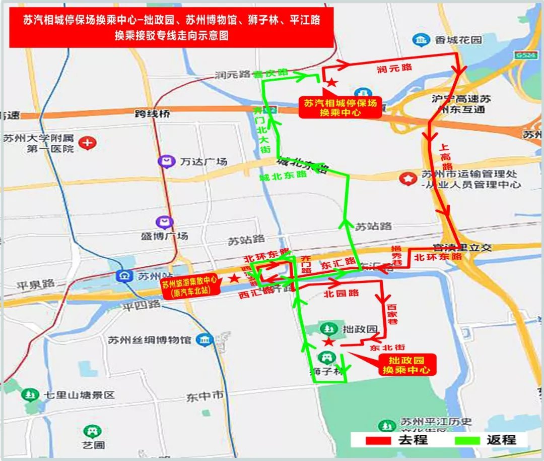 【苏汽相城停保场换乘中心——拙政园换乘中心接驳专线往返线路示意图】