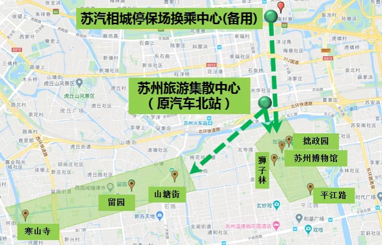 【苏州旅游集散中心(原汽车北站)——山塘街、留园、寒山寺换乘接驳专线往返线路示意图】