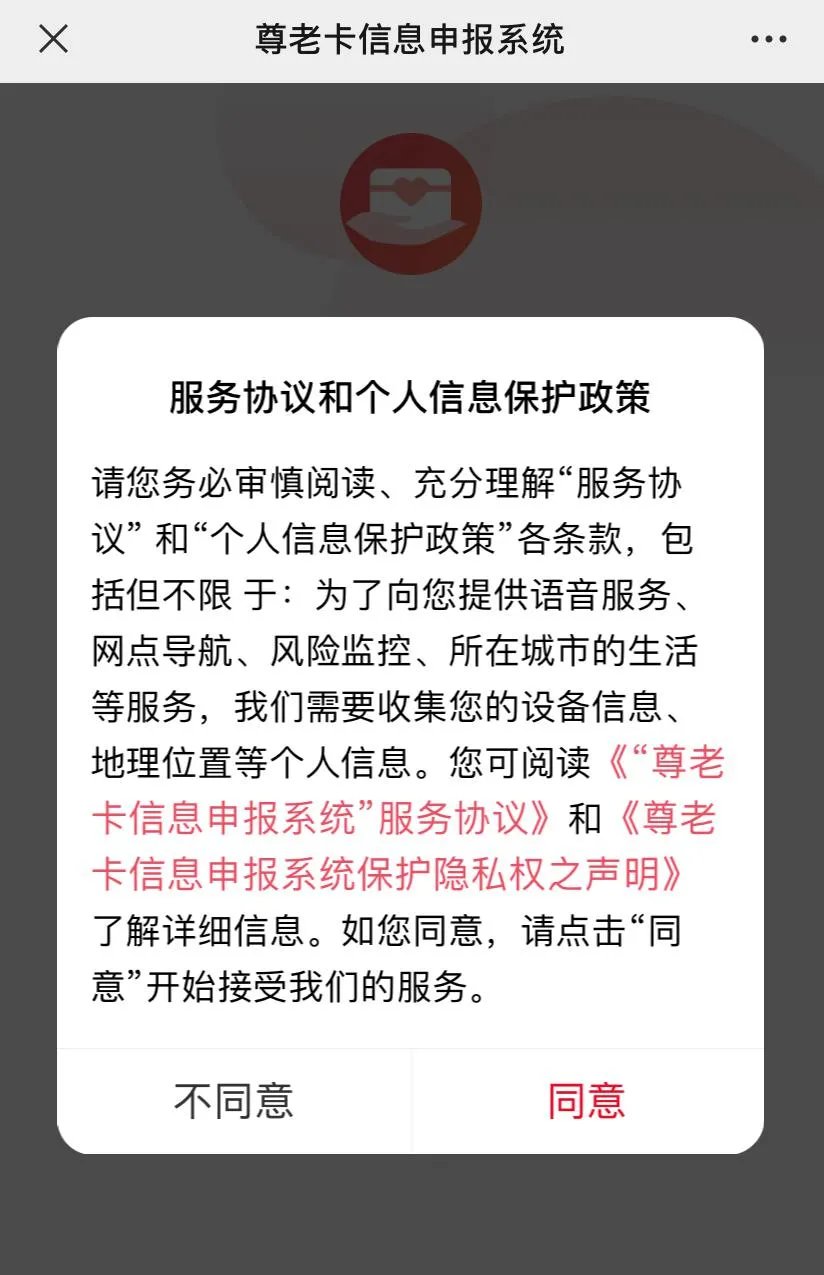 进入"尊老卡申领"页面,看一下服务协议以及个人信息保护政策。点击"同意"后继续。