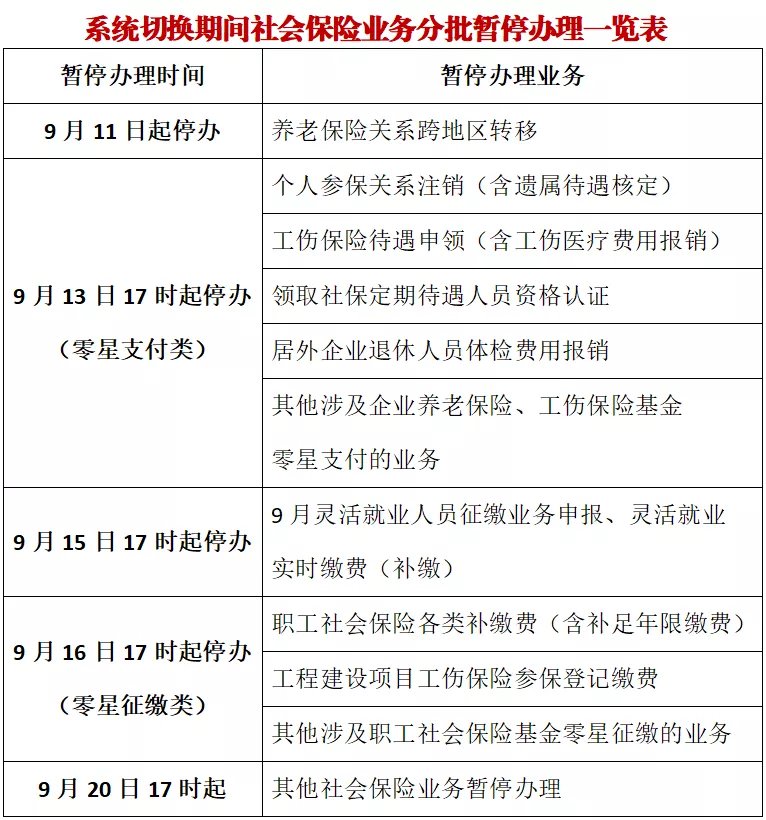 9月11日至9月20日,全市社会保险部分业务将分批暂停。(具体安排见附表)