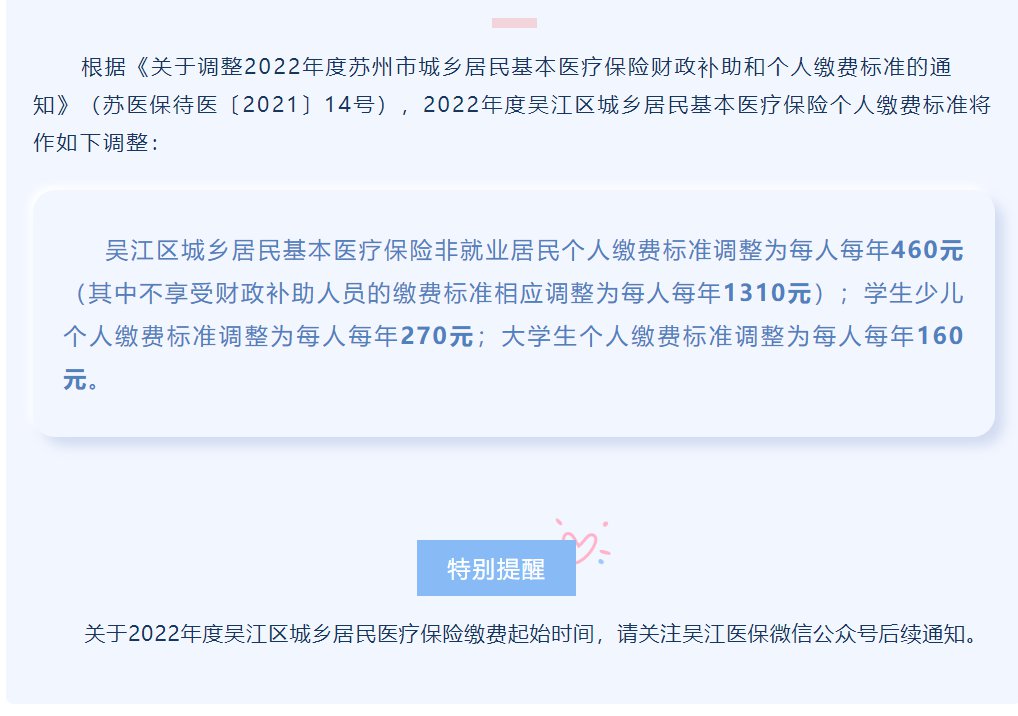 根据《关于调整2022年度苏州市城乡居民基本医疗保险财政补助和个人缴费标准的通知》(苏医保待医〔2021〕14号),2022年度吴江区城乡居民基本医疗保险个人缴费标准将作如上调整。
