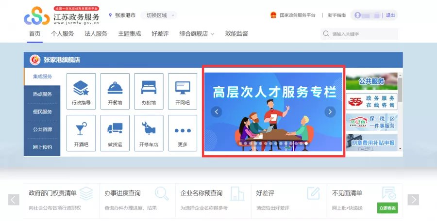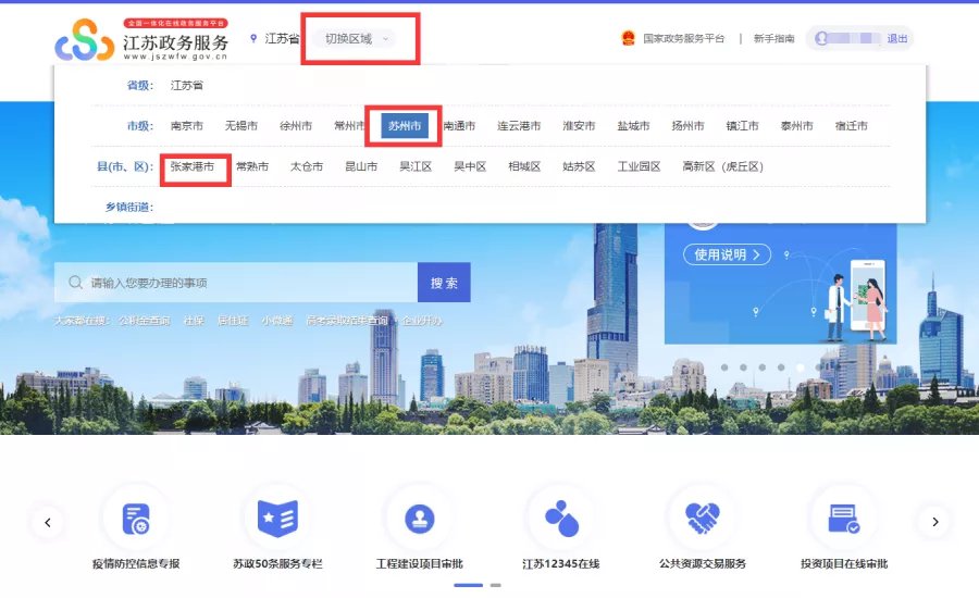 2.申请人成功登陆后,将区域切换成“江苏省、苏州市、张家港市”;