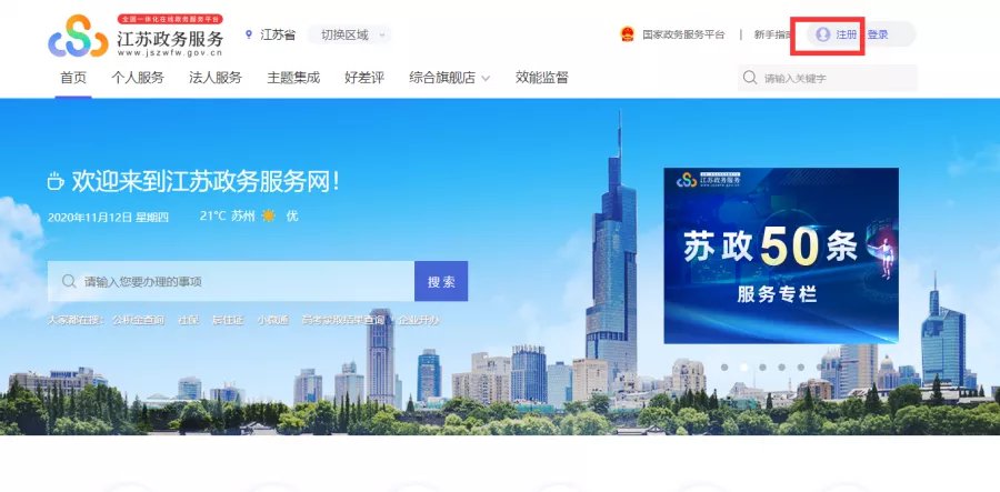 申请人登陆“江苏省政务服务网”http://www.jszwfw.gov.cn/,点击右上角选择“个人注册”,填写个人信息后完成“注册”。