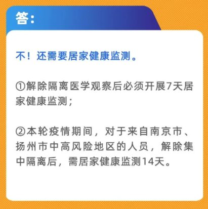 ②本轮疫情期间,对于来自南京市、扬州市中高风险地区的人员,解除集中隔离后,需居家健康监测14天。