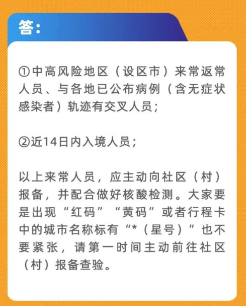 大家要是出现“红码 ”“黄码”或者行程卡中的城市名称标有“* (星号)”也不要紧张,请第一时间主动前往社区(村)报备查验。