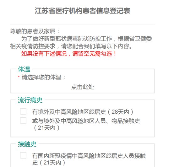 对于电子化设备操作不便的患者,我们特意开通了人工通道,您可在工作人员指导下手工填写《江苏省医疗机构预检分诊操作表》。