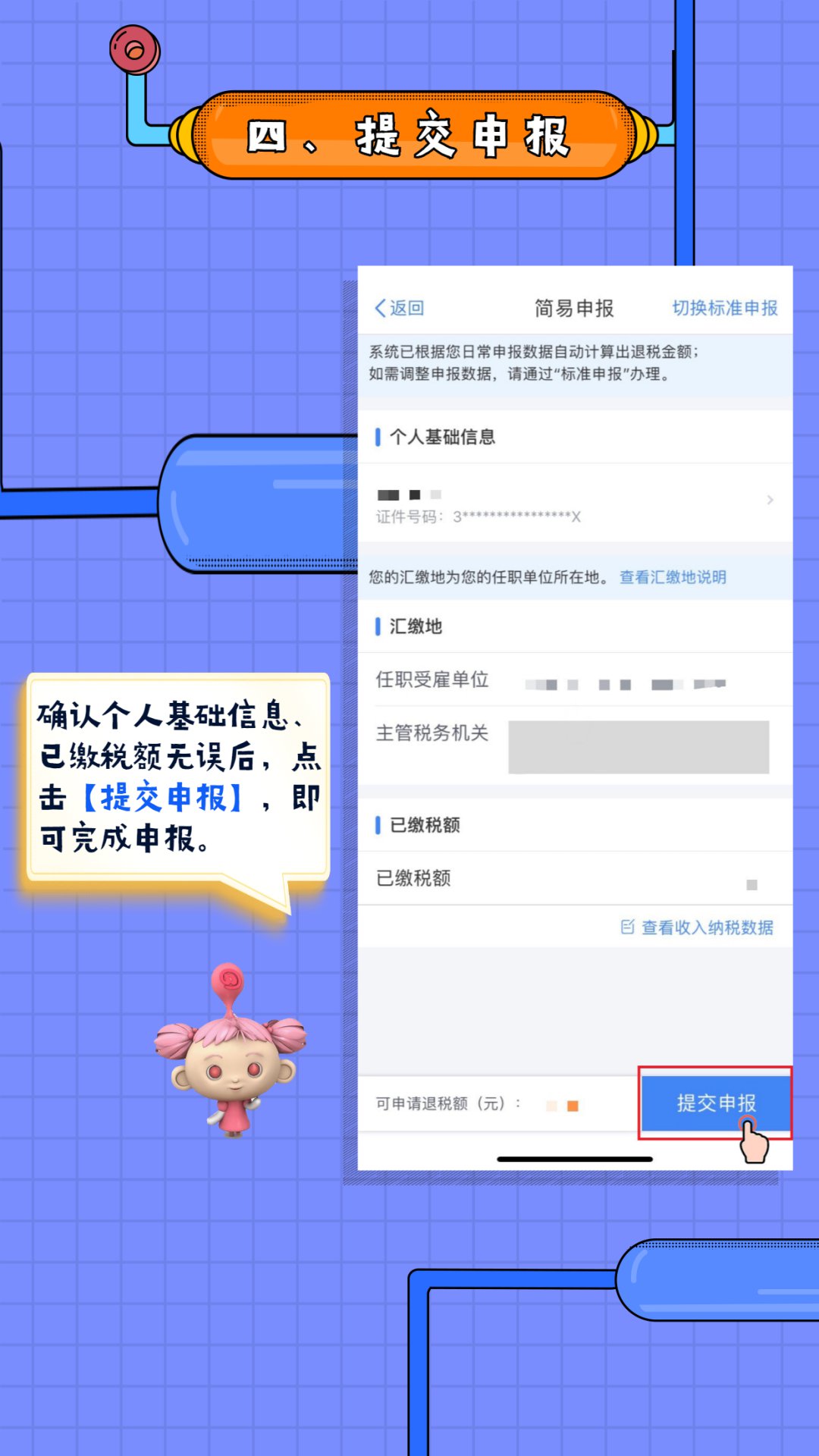 4.确认个人基础信息.已缴税额无误后,点击[提交申报],即可完成申报。