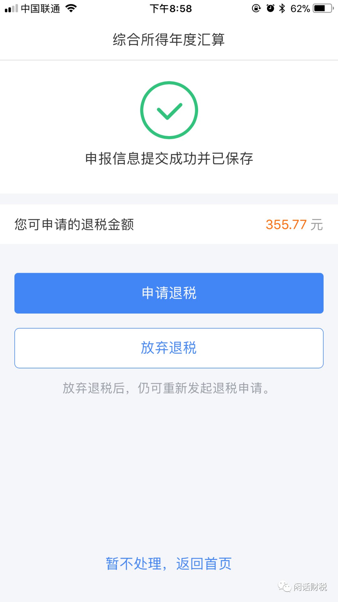 步骤七:之后系统将显示各位应退(补)的税款,如图所示,笔者可以退355.77元个人所得税。