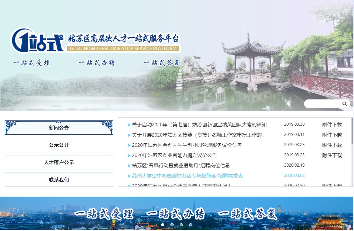 姑苏区高层次人才一站式服务中心官网:http://gccrc.gusu.gov.cn/ (注:2022年3月31日9时起,苏州市人才落户、毕业生落户、人才落户直通车和集体户管理等业务将迁移至“江苏省人力资源和社会保障厅网上办事服务大厅”(https://rs.jshrss.jiangsu.gov.cn)“新系统”办理。)