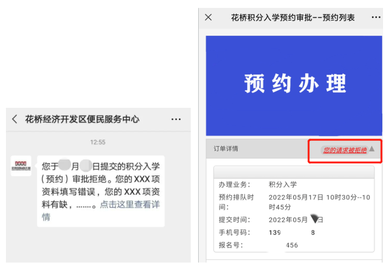 5.如果资料提供不全或有误,系统将暂不予通过预约,并通过花桥经济开发区便民服务中心公众号发出通知消息,注明不通过原因并提供调整指导。家长请及时查看拒绝原因并在原积分入学网上申报系统中及时补全资料后,重新预约。家长前往花桥便民服务中心现场审核办理前,请注意查收公众号消息通知,确保材料无误,别白跑一趟哦。