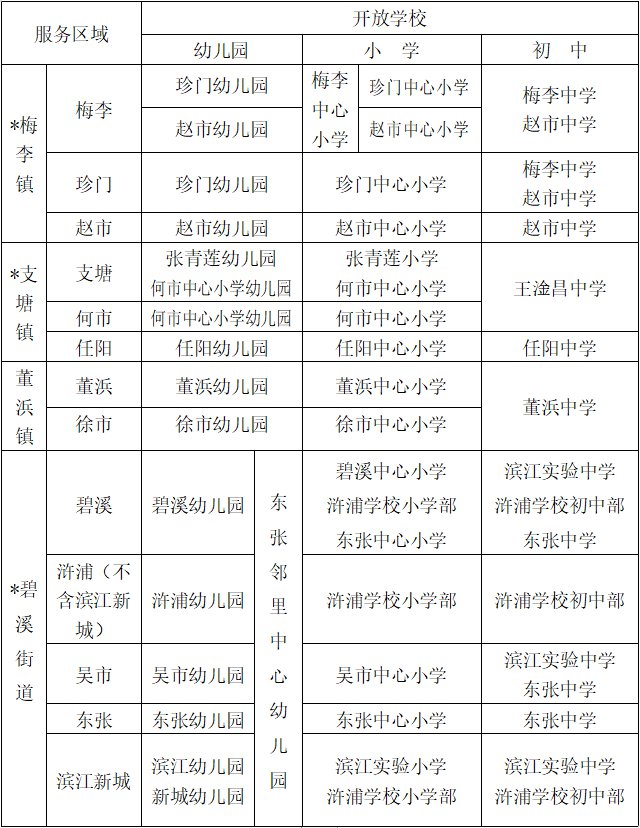 3. 碧溪街道在开放的四所公办幼儿园之外,将普惠性社会办东张邻里中心幼儿园、滨江幼儿园、新城幼儿园(暂名)纳入开放幼儿园名单。其中东张邻里中心幼儿园服务区范围为碧溪街道,滨江幼儿园和新城幼儿园服务区范围为滨江新城。新市民(不含滨江新城)在申请一所对应区域的公办幼儿园以外,还可以申请东张邻里中心幼儿园(平行志愿),滨江新城新市民可在滨江幼儿园、新城幼儿园、东张邻里中心幼儿园中填报平行志愿。碧溪综合服务中心区域新市民申请就读小学,可在碧溪中心小学、浒浦学校小学部、东张中心小学中填报平行志愿;滨江新城区域新市民申请就读小学,可在滨江实验小学、浒浦学校小学部中填报平行志愿。碧溪综合服务中心区域新市民申请就读初中,可在滨江实验中学、浒浦学校初中部、东张中学之中填报平行志愿;吴市综合服务中心区域新市民申请就读初中,可在滨江实验中学、东张中学之中填报平行志愿;滨江新城区域新市民申请就读初中,可在滨江实验中学、浒浦学校初中部中填报平行志愿。所有平行志愿,以分数优先、遵循志愿的方式录取。