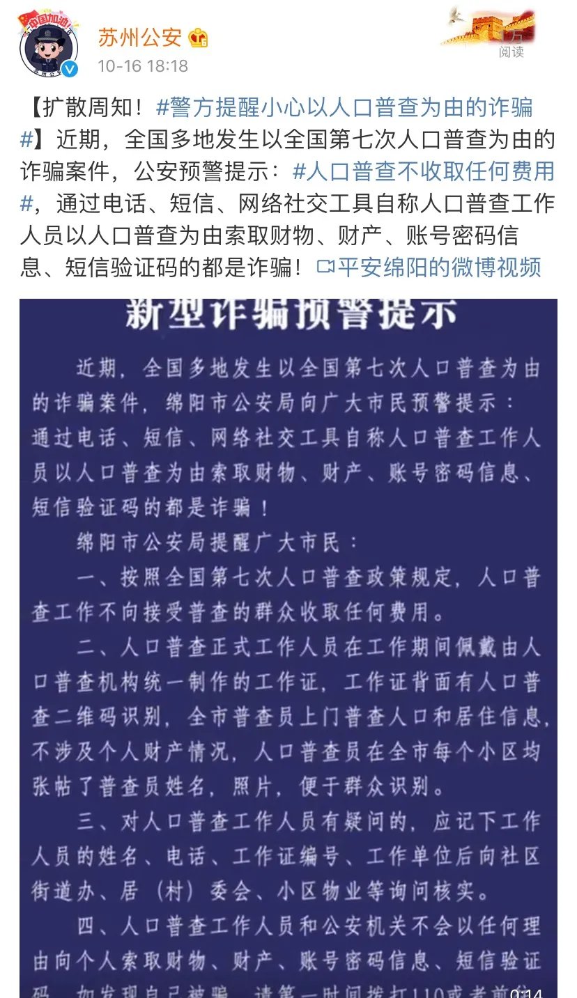 近期,全国多地发生以全国第七次人口普查为由的诈骗案件。