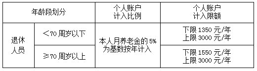 退休人员个人账户按照本人上年度养老金总额的5%计入,不满70周岁的以1350元/人·年为下限,70周岁以上的以1550元/人·年为下限(本市原下限为800元,去年7月1日已调整到位);