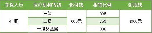 医疗机构等级:一级及基层;起付线:600元;报销比例80%;封顶线:4000元