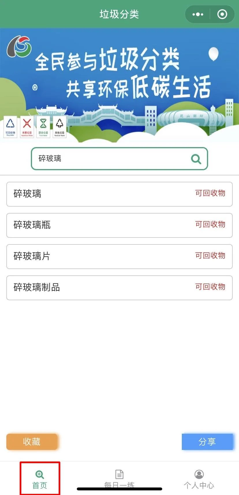 进入首页后,可在首页的搜索栏内输入垃圾种类,即可查询得到对应的生活垃圾属于哪种垃圾类型。