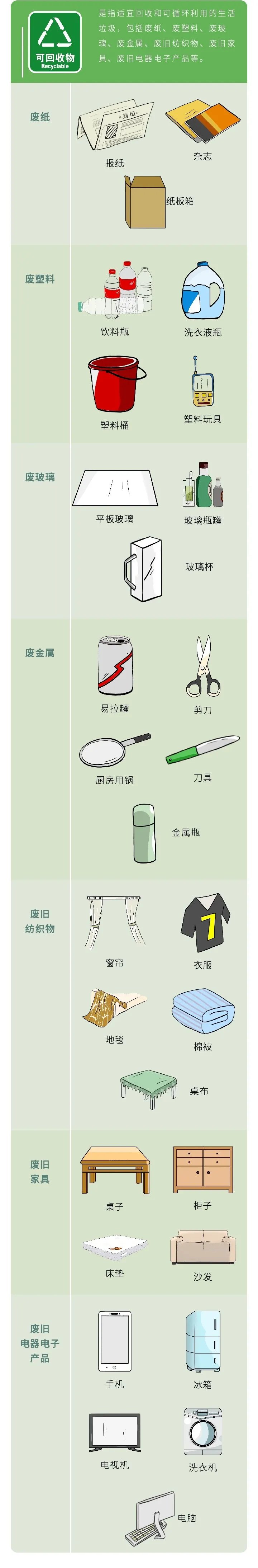 (一)可回收物,是指适宜回收和可循环利用的生活垃圾,包括废纸、废塑料、废玻璃、废金属、废旧纺织物、废旧家具、废旧电器电子产品等;