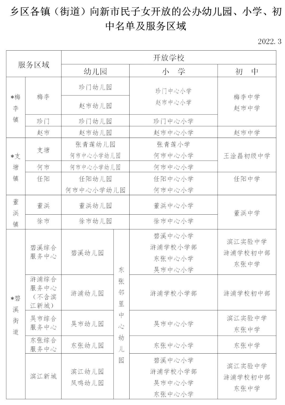 一、乡区各镇(街道)向新市民子女开放的公办幼儿园(含设服务区的社会办幼儿园)、小学、初中及服务区域: