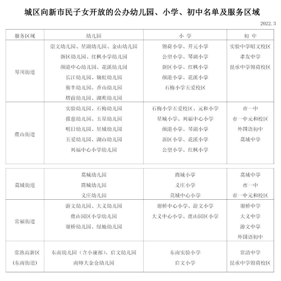 根据《市政府关于印发〈常熟市新市民积分管理办法〉和〈常熟市新市民积分管理计分标准〉的通知》(常政发规字〔2020〕6号)文件精神,结合工作实际,现公布2022年度向全市新市民子女开放的公办学校和幼儿园(含设服务区的社会办幼儿园)名单及服务区域。