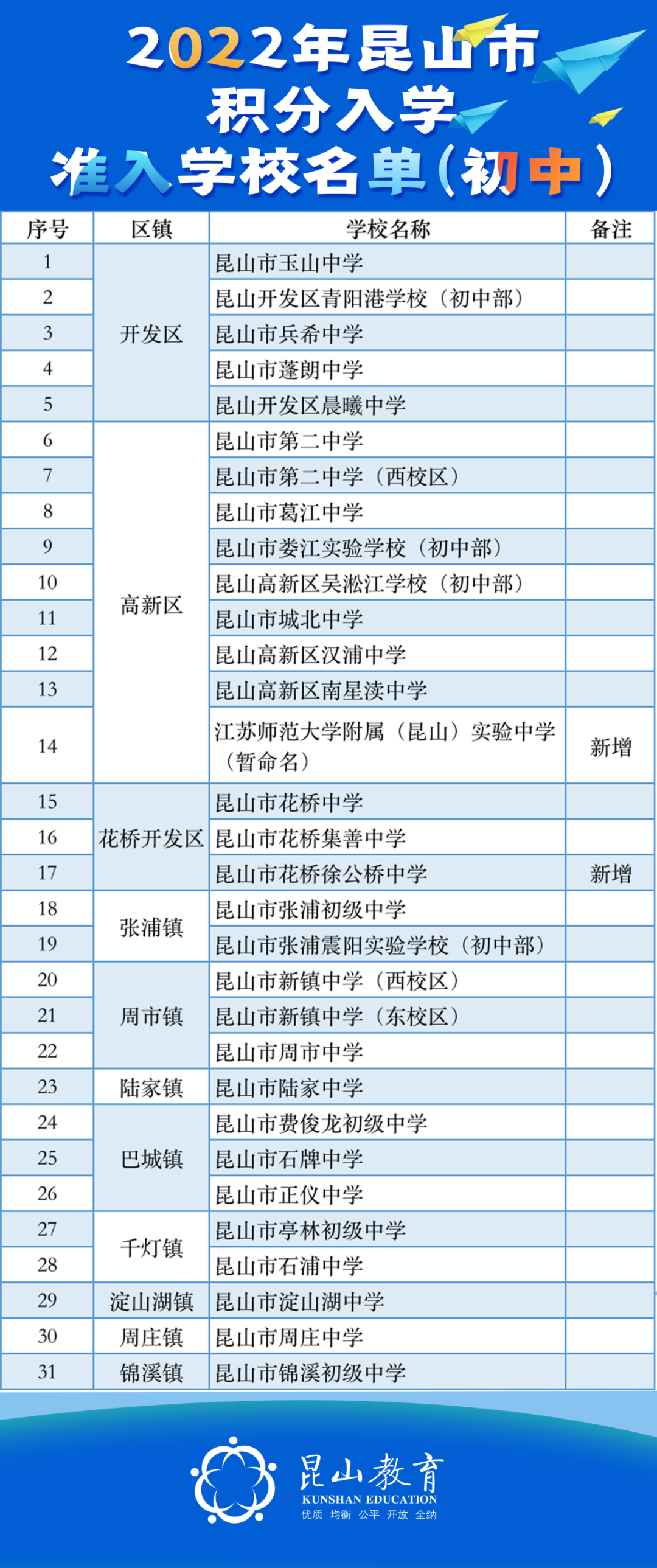昆山市2022年积分入学准入学校名单(初中)