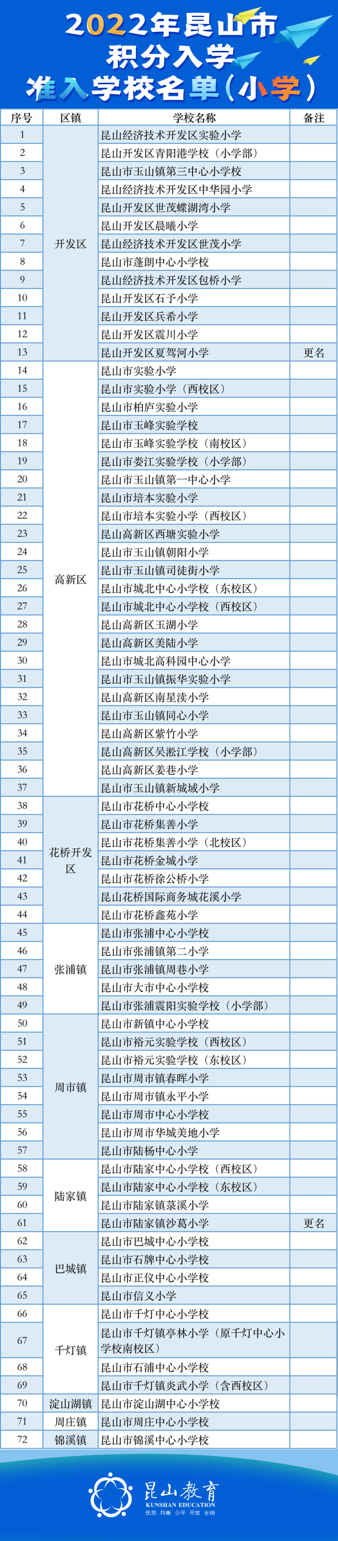 昆山市2022年入学准入学校名单(小学)