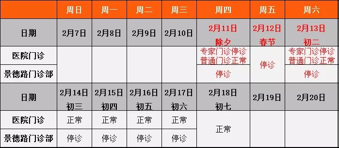 2月11日(星期四)(除夕)、2月13日(星期六)(年初二)春节法定假日专家门诊停诊,普通门诊、急诊照常。