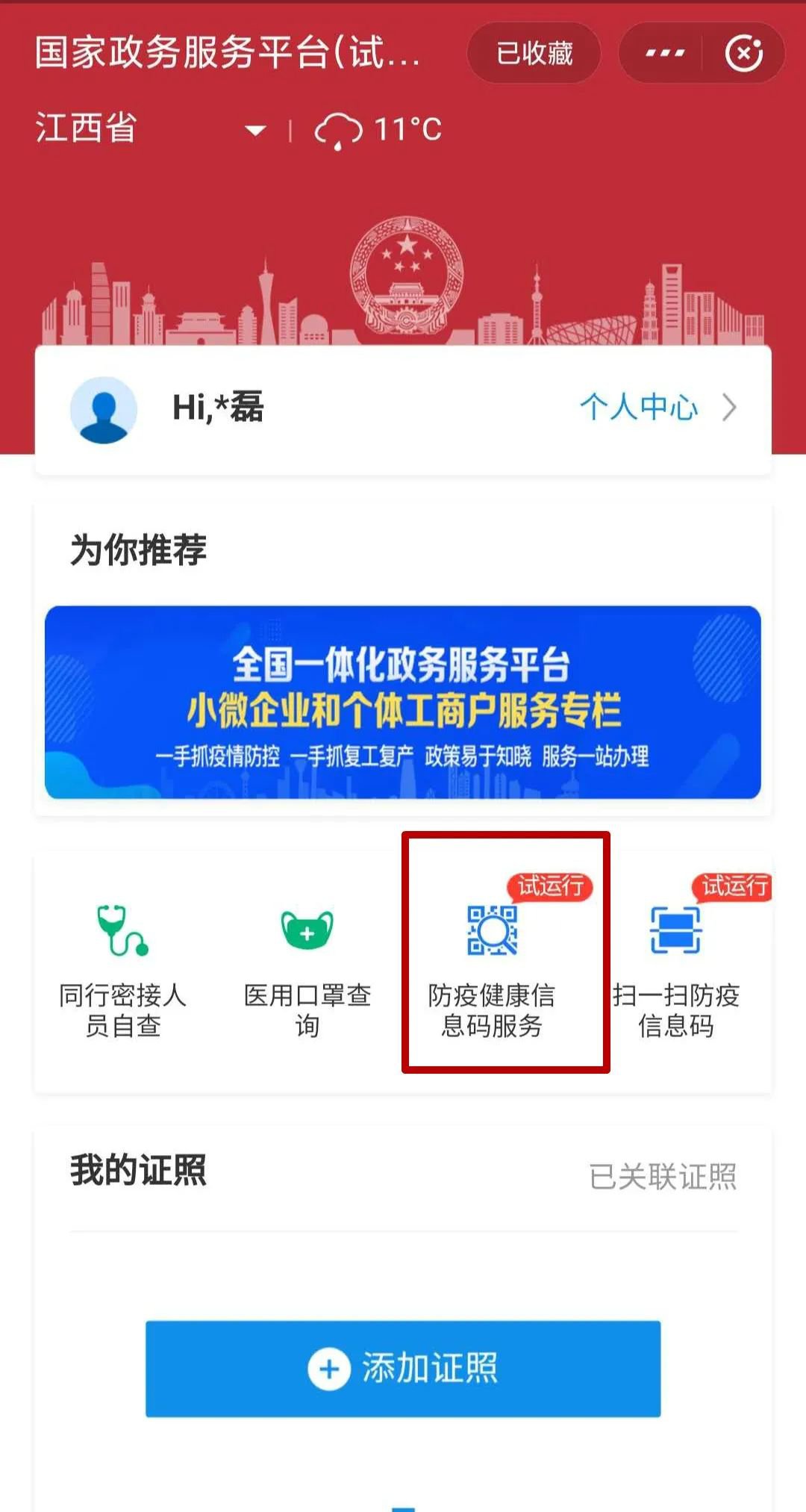 2、点击国家政务服务平台进入小程序页面,可以找到防疫健康信息码的登记入口。