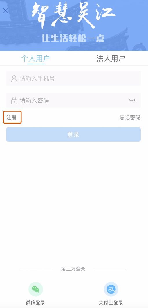 打开“智慧吴江“App,点【我的】>【未登陆】>【注册】进入注册页面,填写手机号码等信息完成注册登陆。