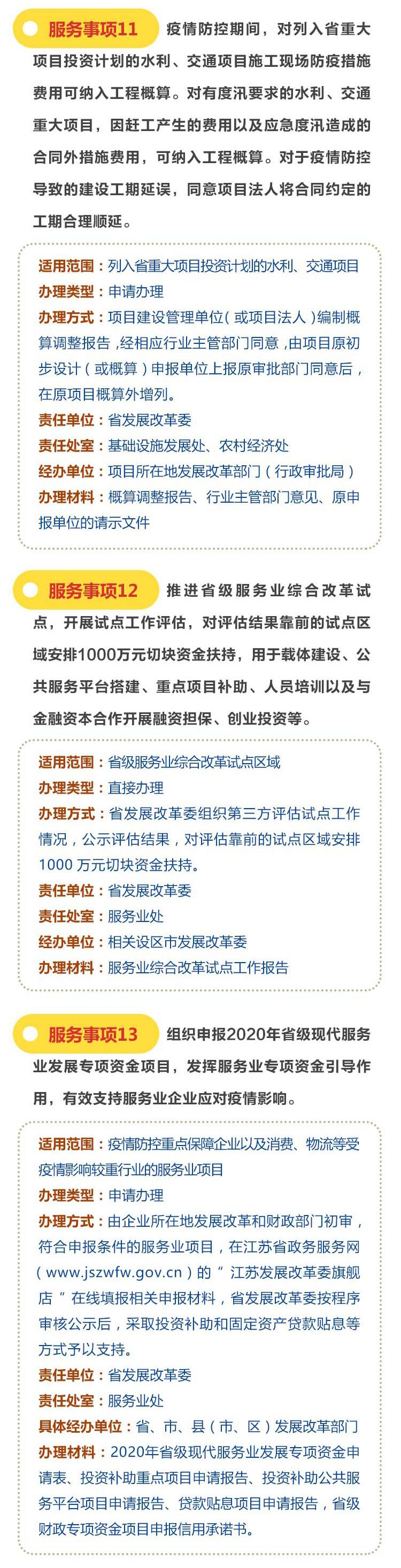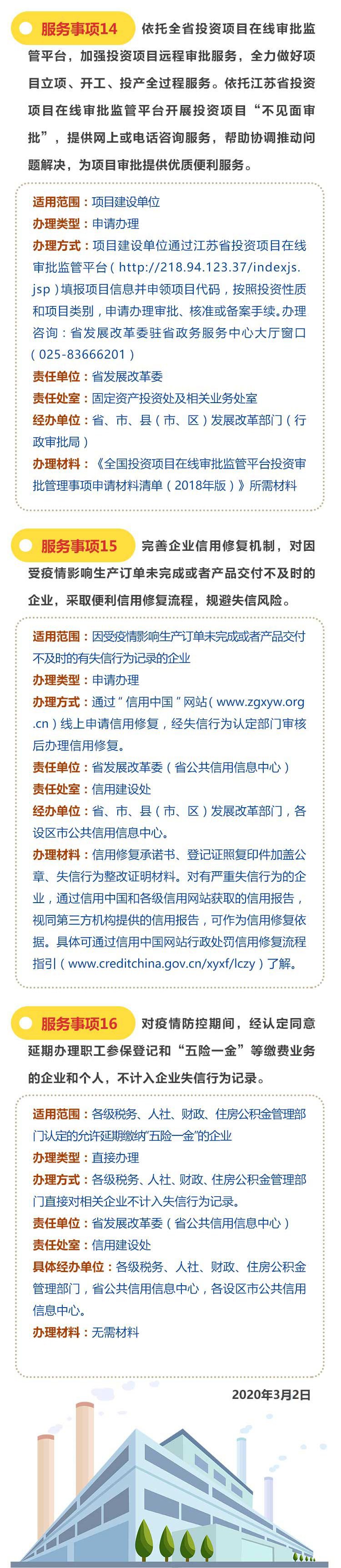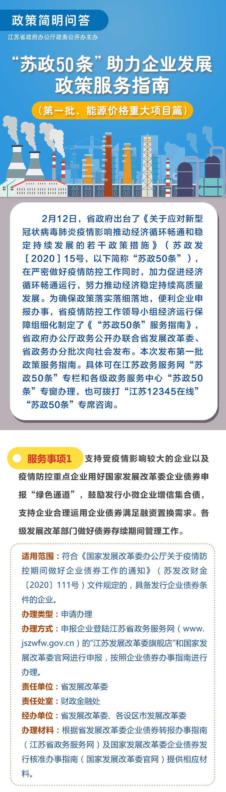 2月12日,省政府出台了《关于应对新型冠状病毒肺炎疫情影响推动经济循环畅通和稳定持续发展的若干政策措施》(简称“苏政50条”),为确保政策落实落细落地,省疫情防控工作领导小组经济运行保障组细化制定了《“苏政50条”政策服务指南》,对企业申办具体服务事项作出指引。