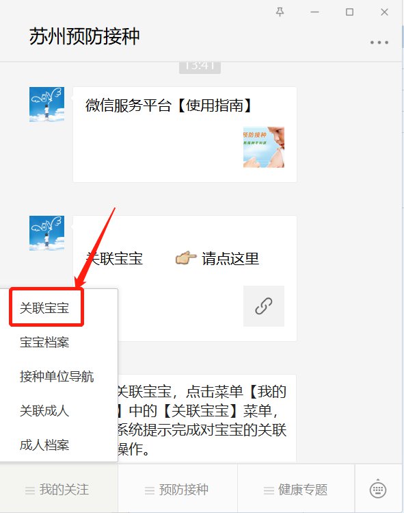 ②在公众号菜单栏选择“我的关注”——“关联宝宝”