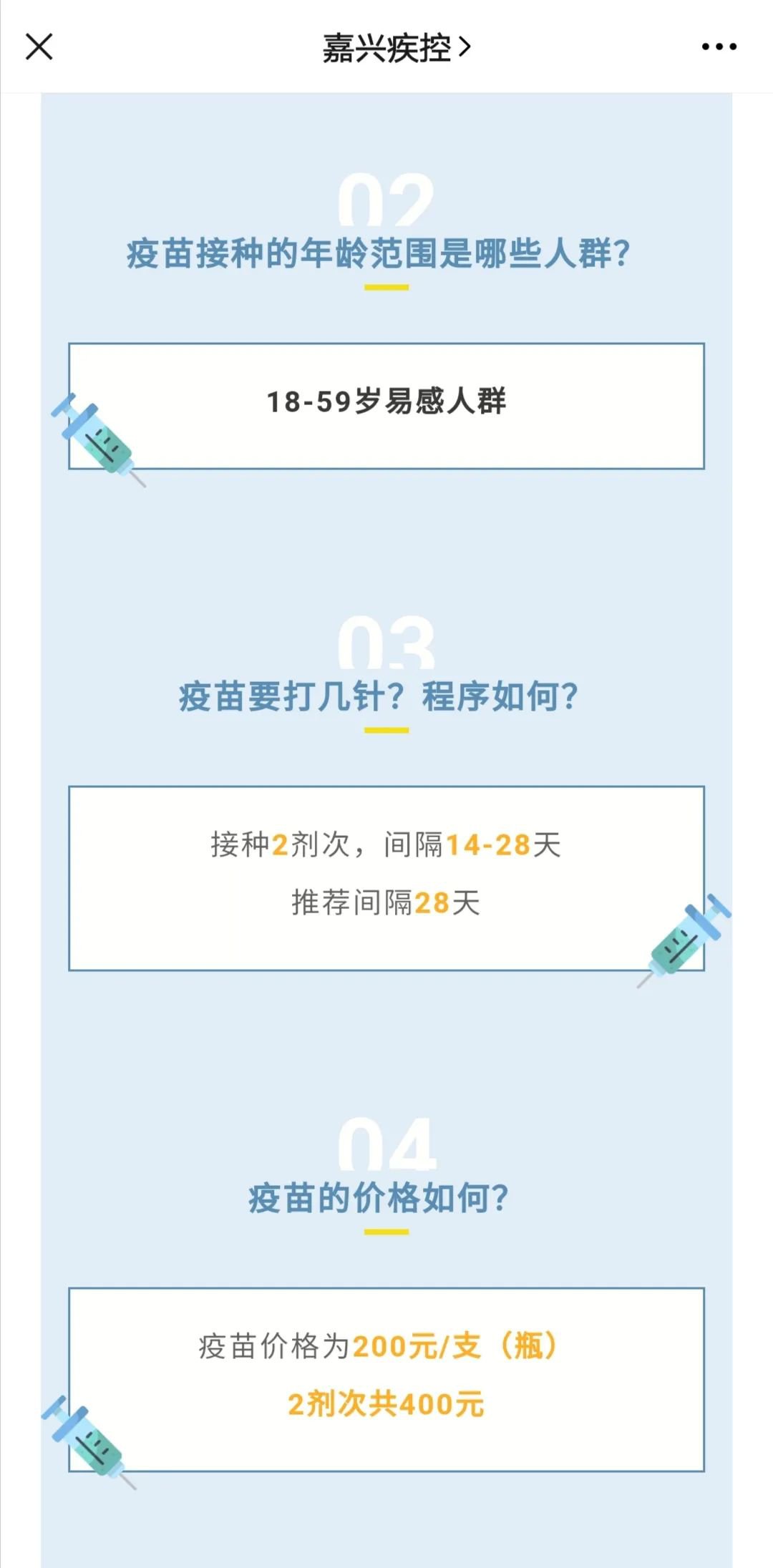 “嘉兴疾控”指出,需要接种2剂次,间隔14-28天(推荐间隔28天),疫苗价格为200元/支(瓶),2剂次共400元。