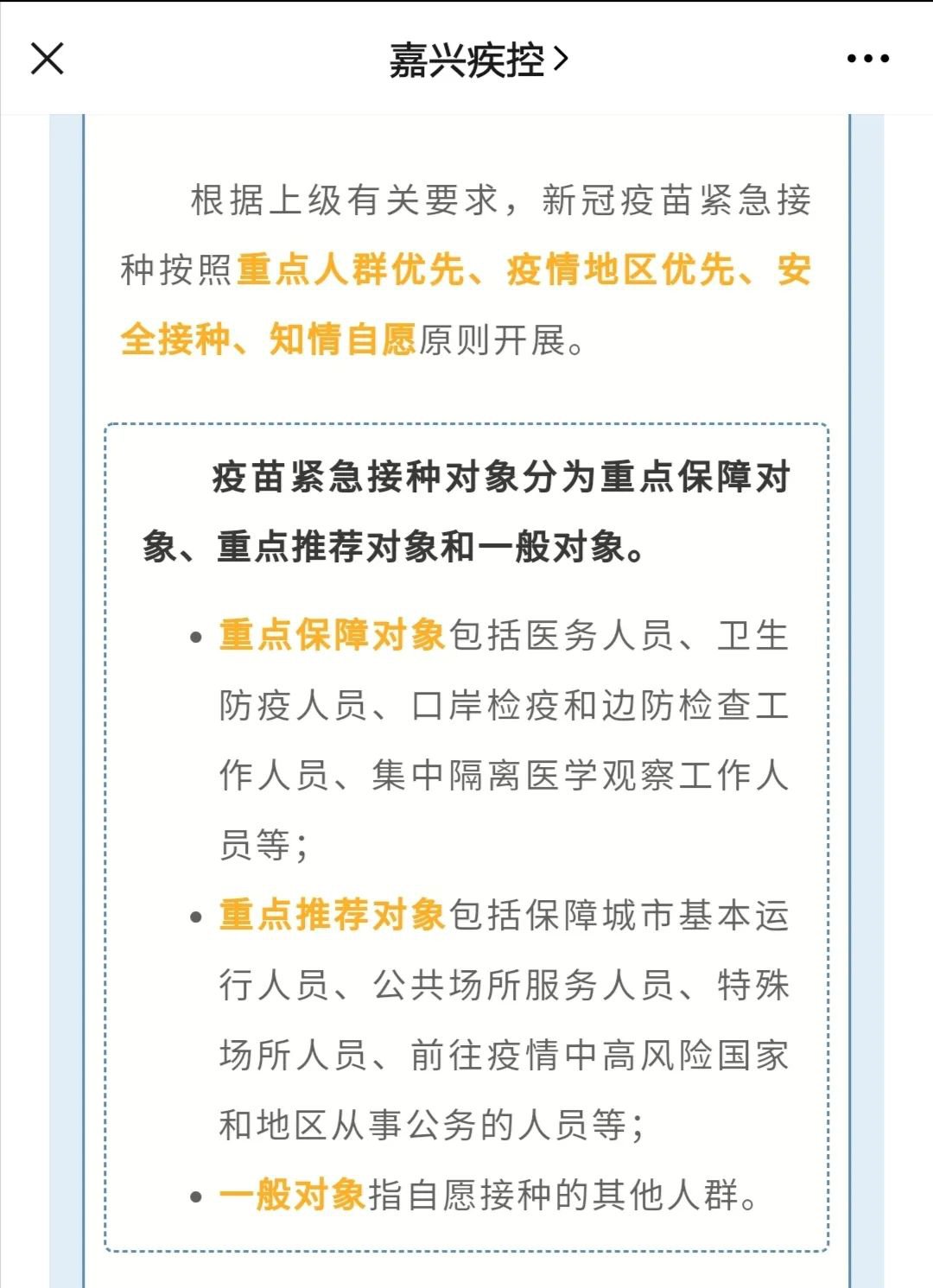 上述《说明》介绍,嘉兴市先期已在重点保障对象中陆续开展新冠疫苗接种,后续将逐步开展一般对象接种。嘉兴市目前用于紧急接种的新冠疫苗由省级部门统一向北京科兴中维生物技术有限公司征订,逐级分发至定点接种单位。该疫苗尚未正式注册上市,经依法批准用于紧急接种。