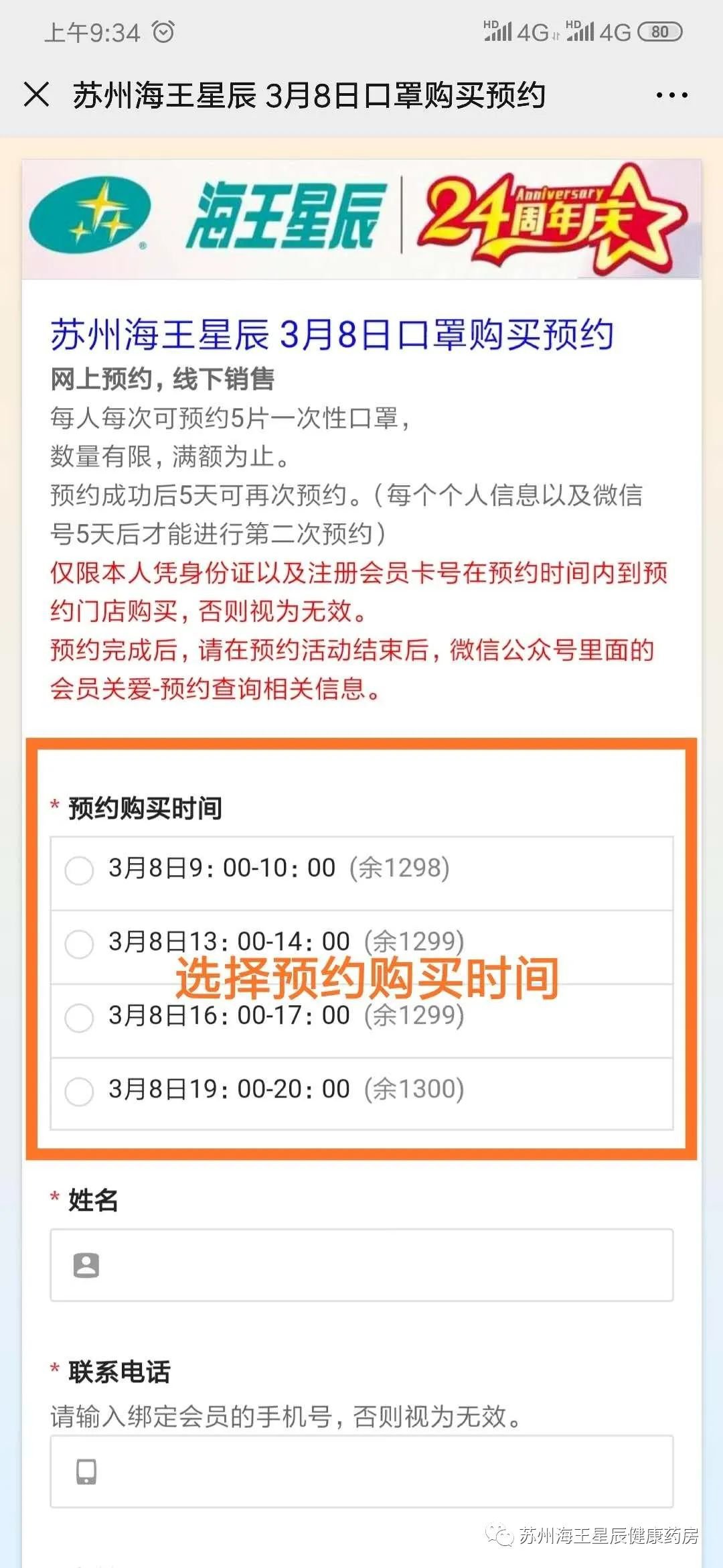 步骤二:进入口罩预约入口,仔细阅读门店预约须知,填写个人信息