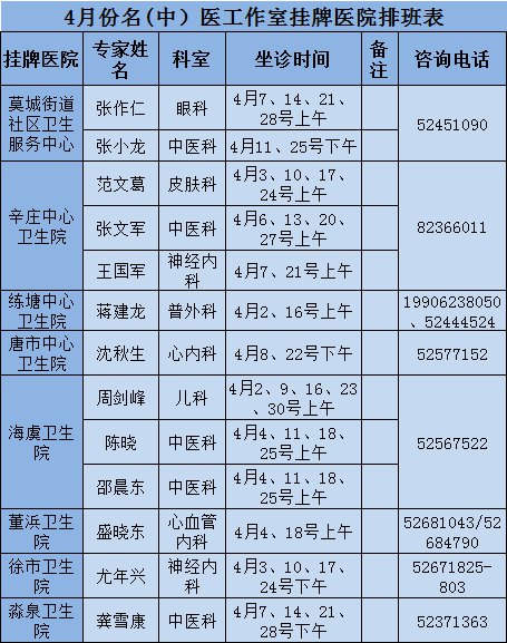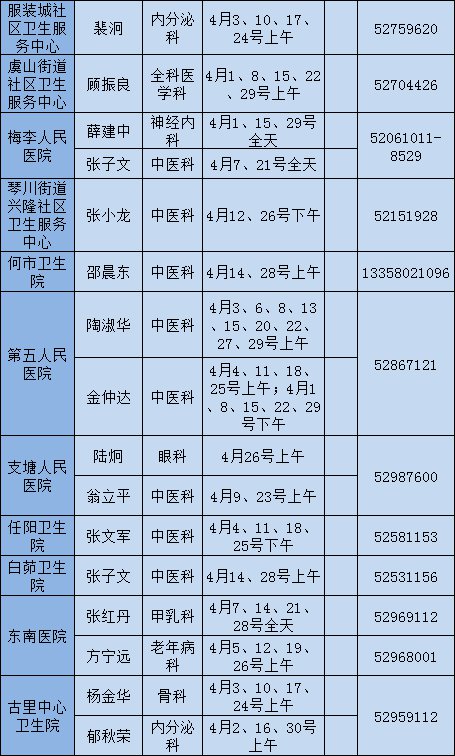 常熟市级医院专家下基层门诊四月排班表