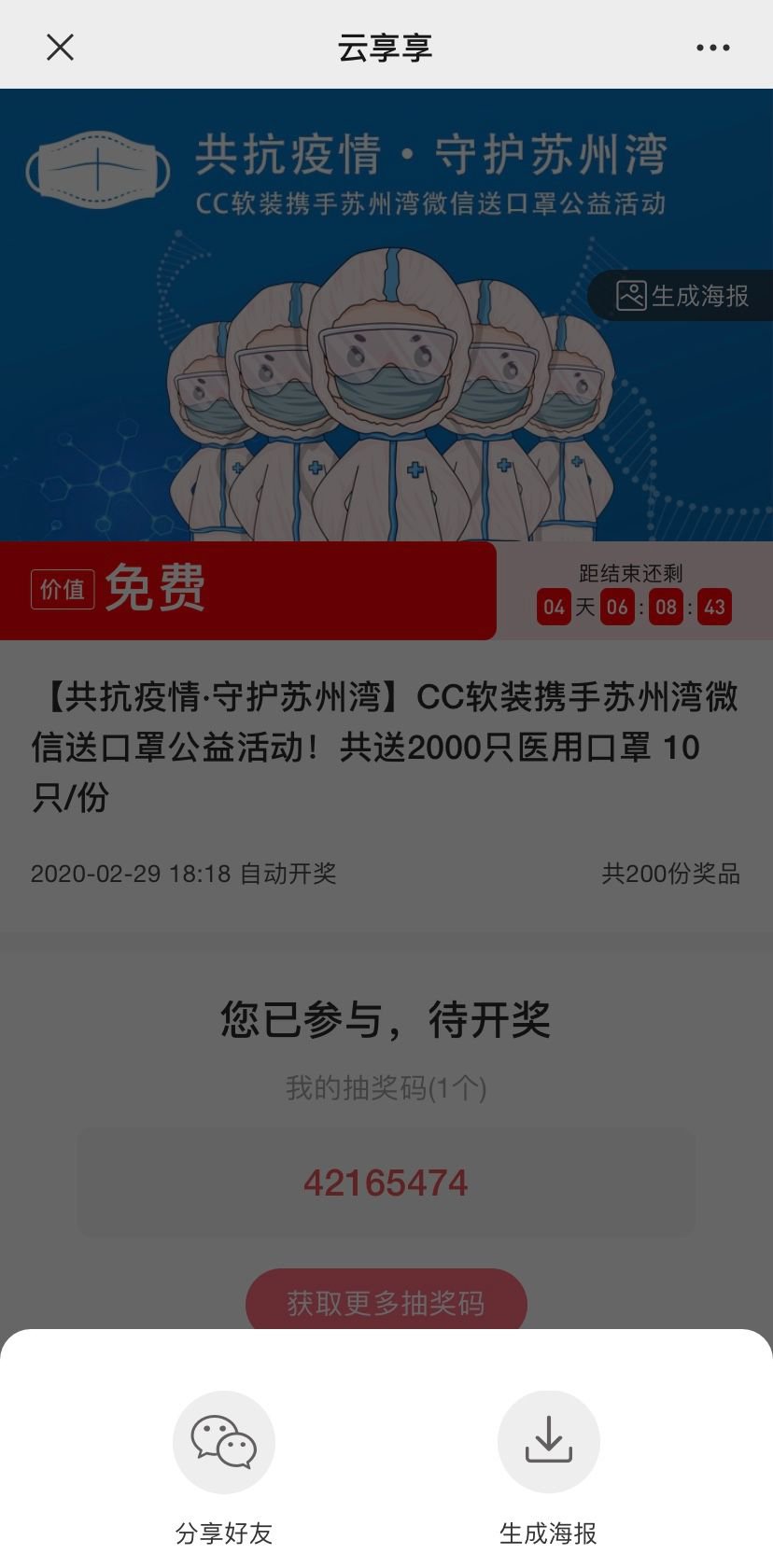 2、若想获取更多机会,点击“获取更多”直接FX好友或生成海报后FX票圈,好友参与后可多一个码。