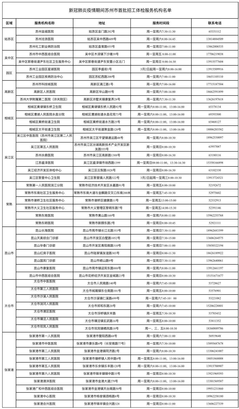 根据苏州市新冠病毒肺炎疫情防控指挥部医疗救助组及企业复工保障和防控组《关于开展企业复工复产相关体检服务的通知》(苏防控医疗救治〔2020〕11号)文件要求,为支持企业复工复产,保护员工身体健康,确保疫情防控与复工复产两不误,现将我市新冠肺炎疫情期间提供招工体检及职业健康检查的首批服务机构名单公布如下: