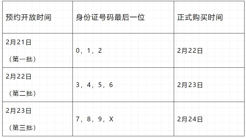 例如:市民身份证号码为320520***********6,可在2月22日19:00~23:55之间进行口罩预约,成功的于2月23日到预约门店线下购买。