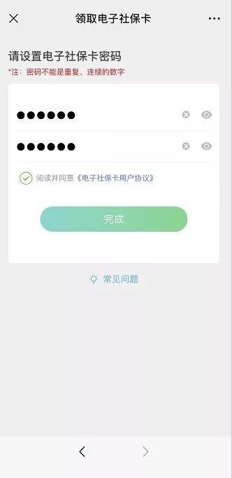6、设置电子社保卡密码,密码为六位数不连续重复的数字密码