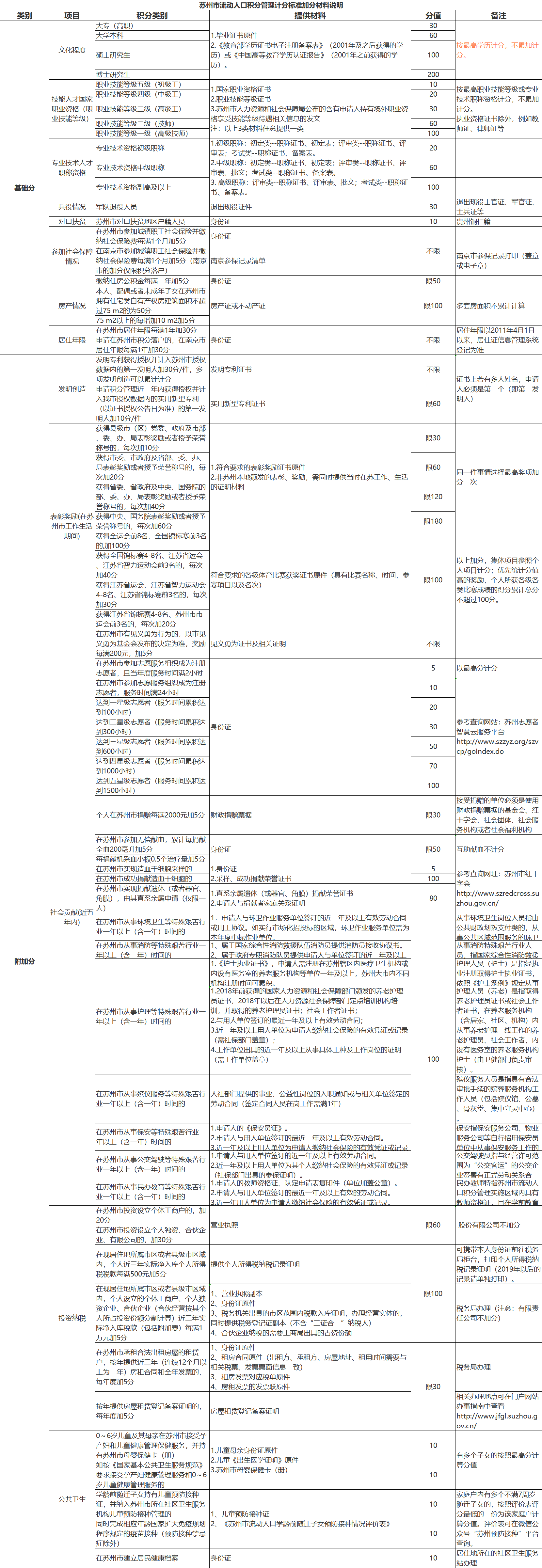| 参加社会保障情况 | 在苏州市参加城镇职工社会保险并缴纳社会保险费每满1个月加5分 | 身份证 | 不限 | ||