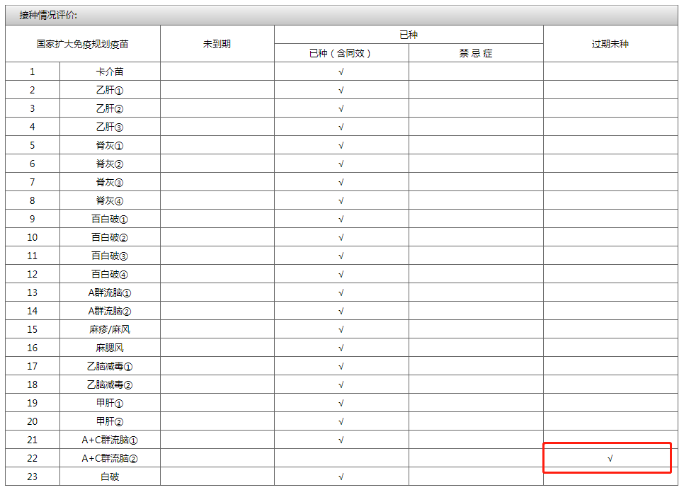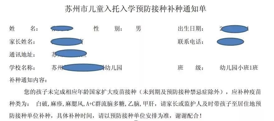 如果您发现打印的《苏州市入学入托儿童预防接种情况评价表》过期未种列有“√”时,或者收到学校出具的《苏州市儿童入托入学预防接种补种通知单》时,为了您家宝宝的健康,请务必及时去现居住地所属的儿童预防接种门诊补种相关疫苗哦!