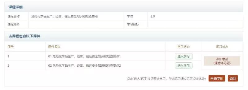 每门课程需播放完成,中间不要退出,可以暂停,完成后达到“已学习”状态,之后才能开始“练习”进行课程测试。