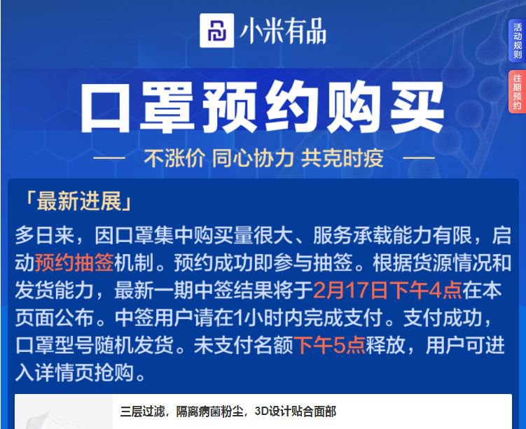 中签结果查询:最新一期中签名单将在下午16:00公布,中签用户请在1小时内支付完成,口罩型号随机发货。未支付名额下午17:00释放,用户可进行再次抢购。